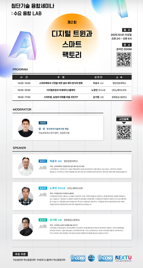 이번 두 번째 세미나에서는 디지털 트윈과 차세대 디스플레이, 스마트팩토리 및 스마트팜을 주제로 심도 있는 논의를 나누고자 하오니 많은 관심과 참여 부탁드립니다.